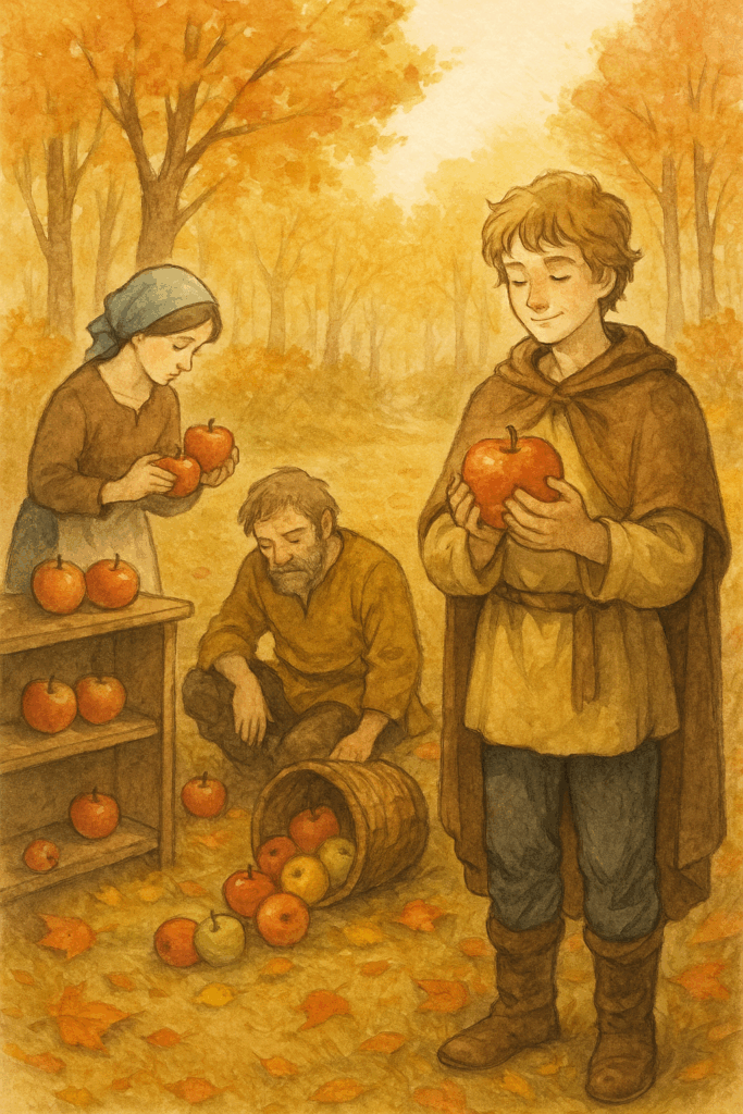 豊かな実りの秋、村人たちは森の恵みを収穫しました。